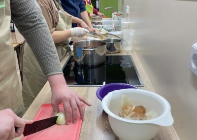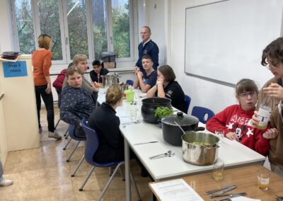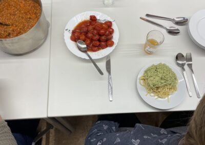 Im Modul „Pasta, Basta!“ bereiteten die Schülerinnen und Schüler drei unterschiedliche Nudelgerichte zu: Pesto Genovese, Bolognese mit großem Linsenanteil und wenig Fleisch sowie Nudeln mit Lachs-Sahne-Soße und Spinat. Dabei lernten sie verschiedene Nudelsorten und deren Besonderheiten kennen, erfuhren mehr über Unterschiede in der Nudelproduktion und konnten aktiv beim Kochen mitwirken. So wurden neue Geschmäcker entdeckt, Teamarbeit gestärkt und Inklusion auf genussvolle Weise erlebbar gemacht.